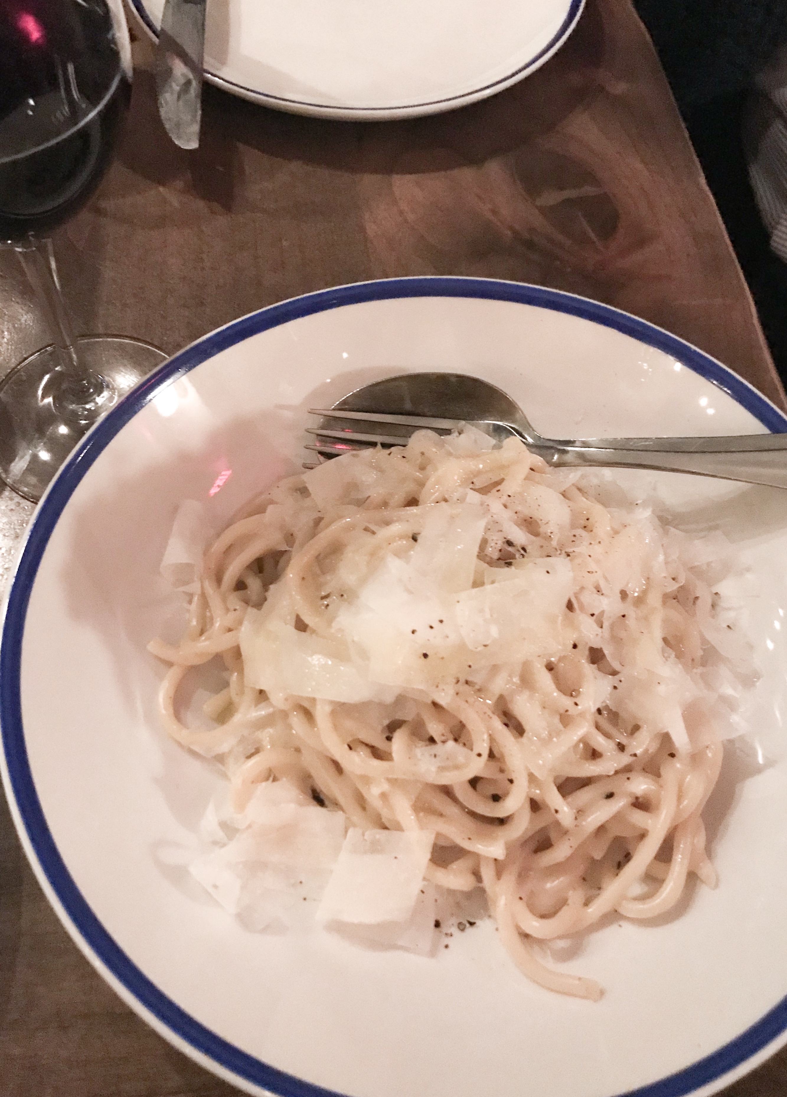 Amatriciana is a savoury and slightly spicy pasta sauce that was served over bigoli noodles and topped with crispy pancetta and pecorino romano. It was the perfect combination of salty and sweet.
